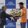また、6月1日には、「豊川リレーマラソン2025」の会場であるOKAKENアスリートフィールドにて、今泉秀哉とよかわフラワープロジェクト会長より、ゲストランナーの照英氏にバラの花束を贈呈しました。